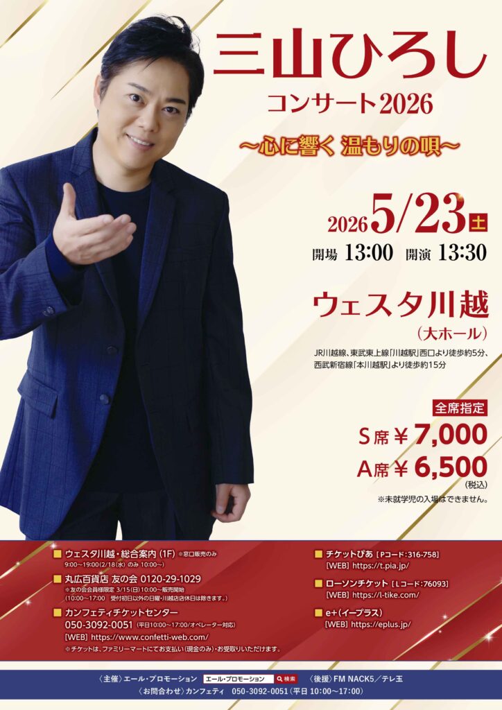 ▶ 2026年5月23日 三山ひろし(ウェスタ川越)の公演情報を公開いたしました。