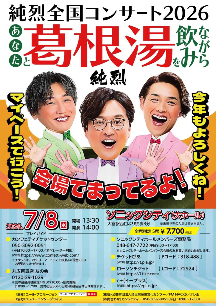 ▶ 2026年7月8日 純烈(大宮ソニックシティ)の公演情報を公開いたしました。