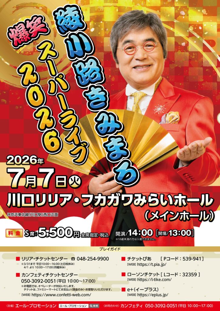 ▶ 2026年7月7日 綾小路きみまろ(川口リリア・フカガワみらいホール(メインホール))の公演情報を公開いたしました。